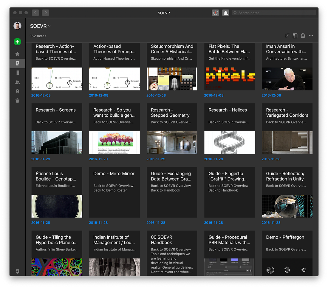 A ton of ideas went into each cycle, and a ton of lessons came out. Keeping track of them all would have been impossible without a digital notebook. In school I had used Evernote, so that’s what I started using at the studio too. Everything ended up in there: web clippings, screenshots, copies of emails, code snippets, stray thoughts while riding the subway, concept write-ups, feedback from Olafur, documentation of finished demos.